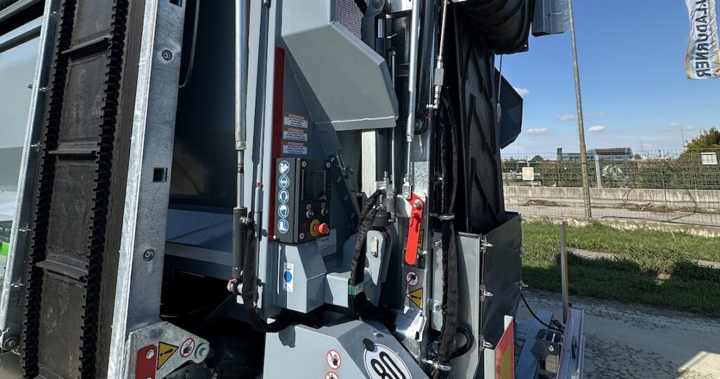 – Optional: deplasticiser, in electric (10 kW) or hydraulic (30 L oil x 150 bar pressure) version, to be fitted on the oversize belt in case of impurities present during screening. It blows air and sucks up the plastic material from above and conveys it elsewhere. In this way, the material screened on the oversize belt comes out clean and of the grain size chosen according to the drum.